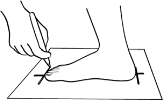 In a straight line from the middle of the heel to the longest toe, measure the length of each foot.